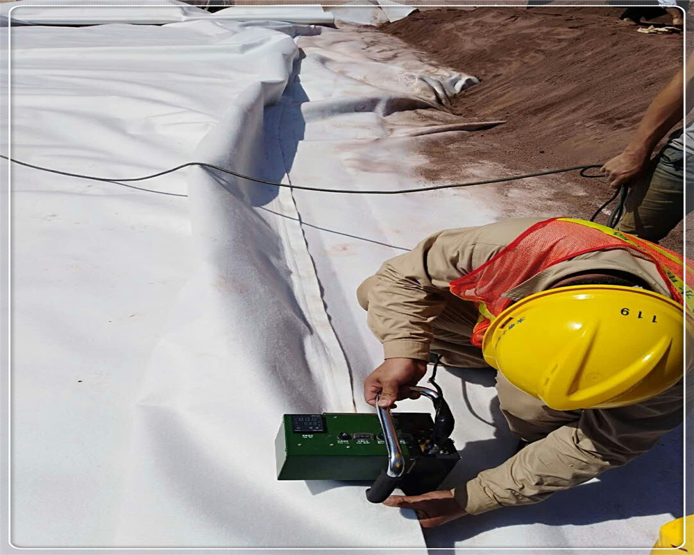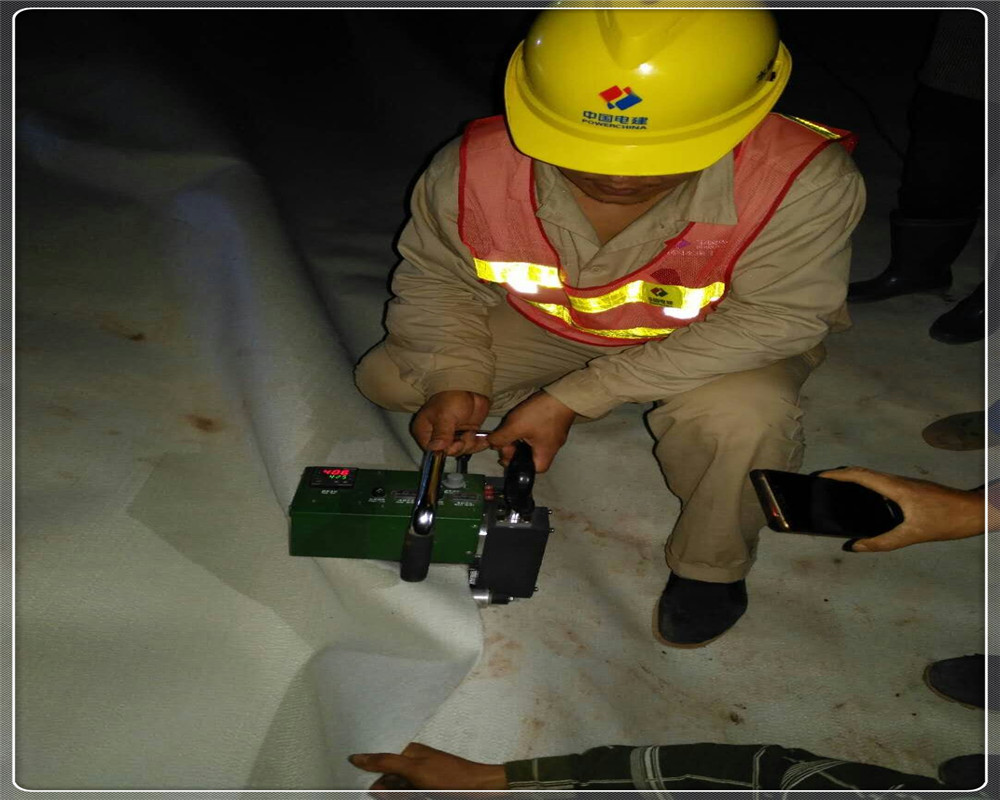 樞紐主要由復合土工膜堆石壩、溢洪道、引水發電系統、放空洞組成。復合土工膜堆石壩壩高85m,為高比例(達81%)軟巖填筑,軟巖填筑比例在同類型壩中世界之高。大壩防滲體采用復合土工膜防滲面板。土工膜之間的焊接和土工膜在錨帶部位的焊接,兩部位均采用熱風粘合的方式。土工膜與土工膜之間的焊接采用全自動風焊機進行,焊接帶的寬度為65mm,中間留有15mm的檢查氣孔,兩側各有25mm寬的粘合段。