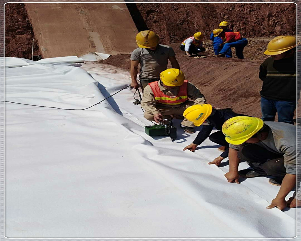 在堆石壩軟巖填筑比例大情況下,土工膜直接設置在壩面做為永久性防滲面墻且不設面層保護,和鋼筋混凝土面板相比,復合土工膜防滲面板適應壩體較大沉降變形,使用中有一定褶皺但無破損現象,即使破壞也只需局部切割修補方便,土工膜與趾板的連接做法先進。